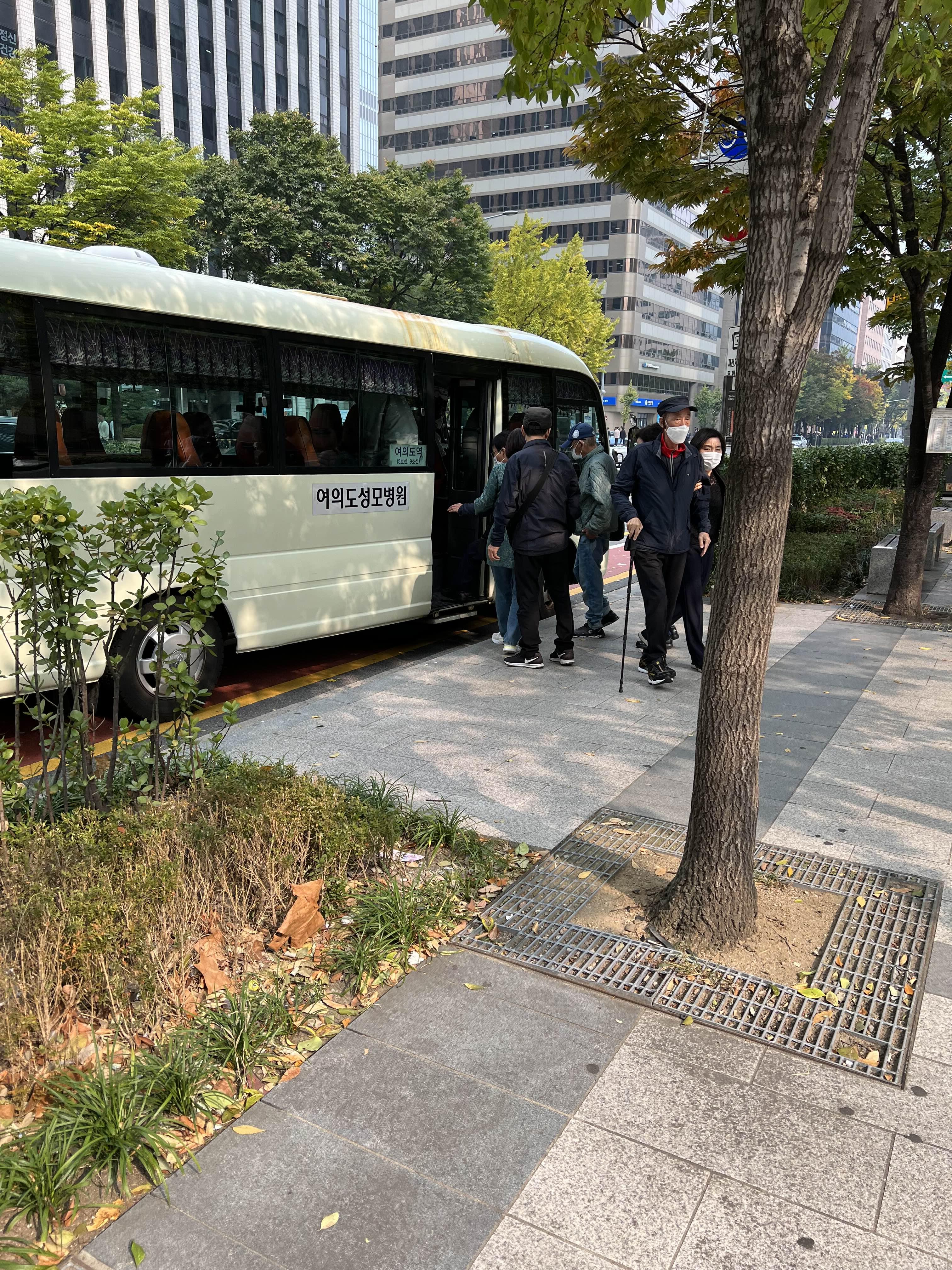 셔틀버스 표지판이 이렇게 있습니다. 여기에서 탑승하시면 됩니다. 그런데 자세히 보면 63빌딩 셔틀탑승장소라고 되어있어요. 성모병원 셔틀탑승 장소라고 큰 글씨로 적어두면 어르신들이 찾기 더 좋을 것 같은데 아쉽긴 합니다.