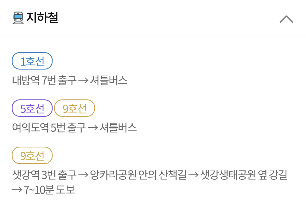 지하철역 하차 후 걸어서 가려면 샛강역으로 가는게 좋지만 10분 이상 걸려요. 대방역, 여의도역에서는 무료셔틀을 운행하고 있으니 이걸 이용하시면 좋습니다.
