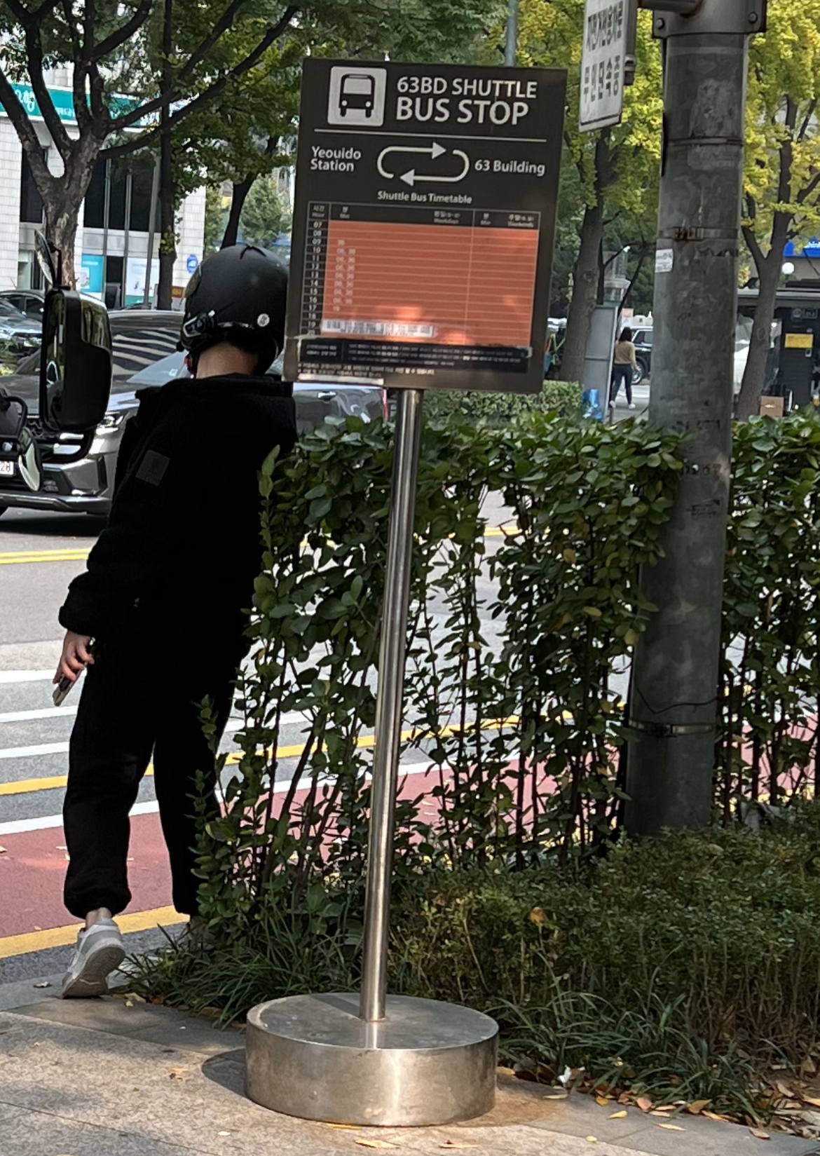셔틀버스 표지판이 이렇게 있습니다. 여기에서 탑승하시면 됩니다. 그런데 자세히 보면 63빌딩 셔틀탑승장소라고 되어있어요. 성모병원 셔틀탑승 장소라고 큰 글씨로 적어두면 어르신들이 찾기 더 좋을 것 같은데 아쉽긴 합니다.